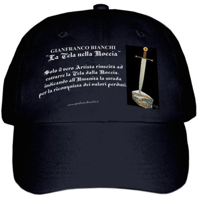 Cappellino nero con l'opera "La Tela nella Roccia" dell'artista Gianfranco Bianchi