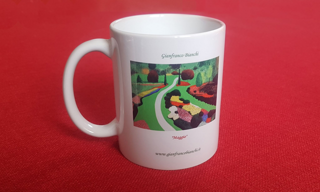 Stampa su due lati su tazza Mug in ceramica dell'opera "Maggio" di Gianfranco Bianchi.